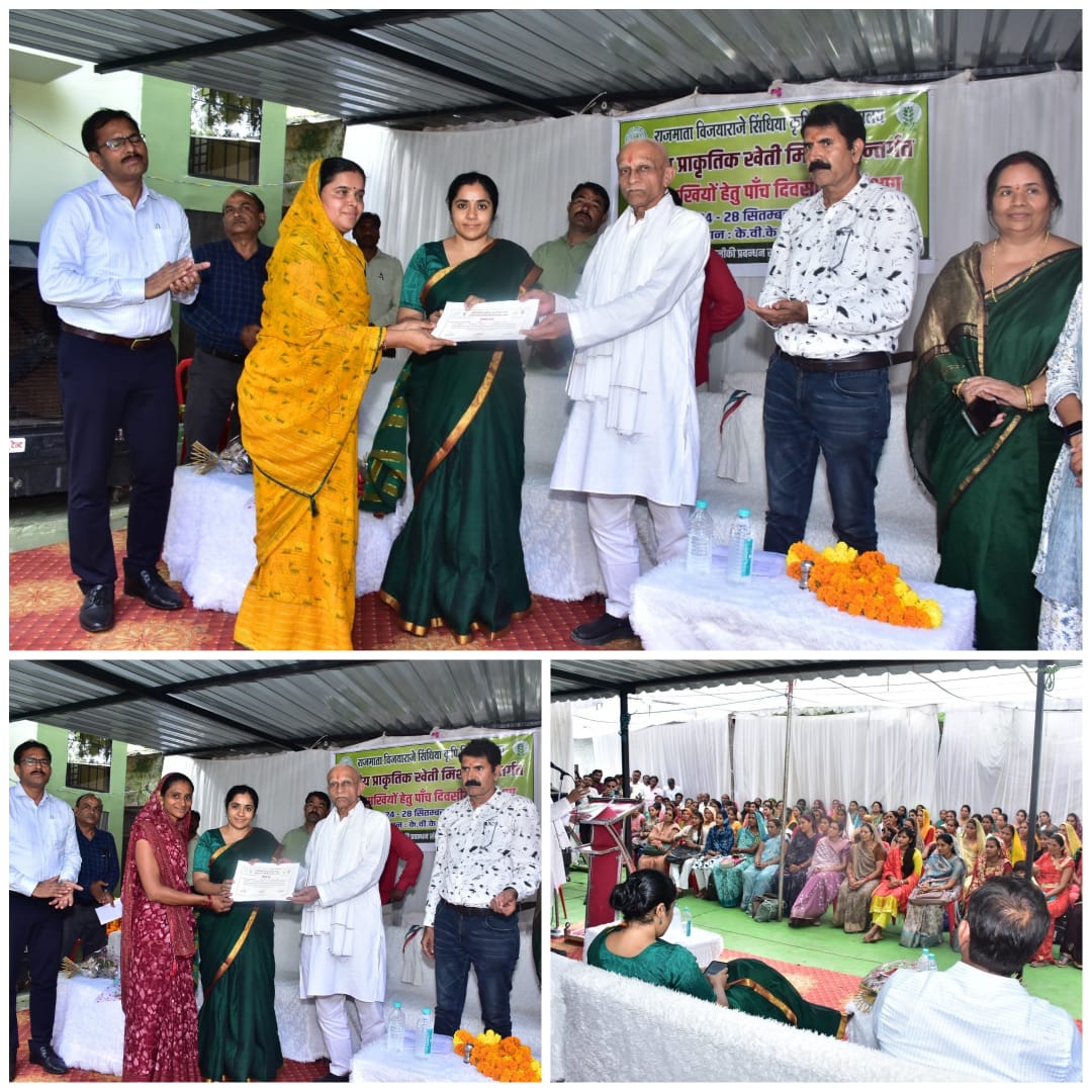 खरगोन। राष्ट्रीय प्राकृतिक खेती मिशन के अंतर्गत परियोजना संचालक आत्मा किसान कल्याण तथा कृषि विकास विभाग खरगोन एवं एन.आर.एल.एम. की निर्धारित मापदंड के अनुसार चयनित 96 कृषि सखियों के पांच दिवसीय प्रशिक्षण का आयोजन 24 सितंबर से 28 सितंबर 2025 तक किया गया। 29 सितंबर को कलेक्टर भव्या मित्तल एवं विधायक बालकृष्ण पाटीदार द्वारा प्रशिक्षित कृषि सखियों को प्रमाण पत्र वितरित किए और उनका उत्साहवर्धन किया।