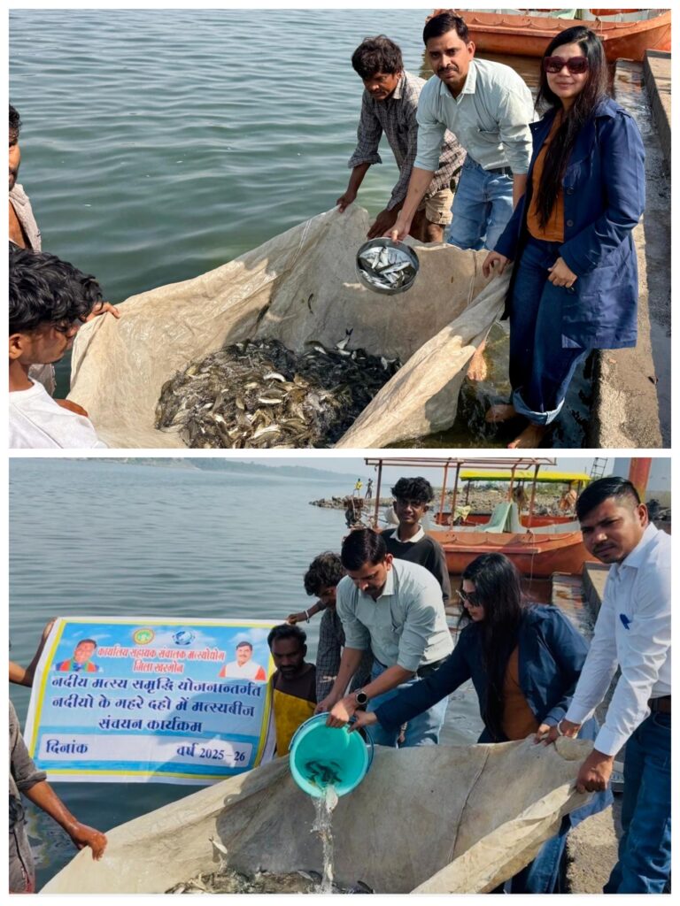 खरगोन । जिले में मत्स्य विभाग द्वारा संचालित नदी समृद्धि योजना अंतर्गत नदी के गहरे दहो में मत्स्य बीज संचयन कार्यक्रम अंतर्गत पारिस्थितिक तंत्र एवं जैव विविधता को बनाए रखने तथा नदी के मत्स्य भंडार की वृद्धि एवं स्थानीय मछुआरों की आजीविका एवं रोजगार उपलब्ध कराने के उद्देश्य से नर्मदा नदी में ग्राम नावड़ा टोड़ी में उन्नत मत्स्य बीज अंगुलिकाओं का संचयन किया गया।
