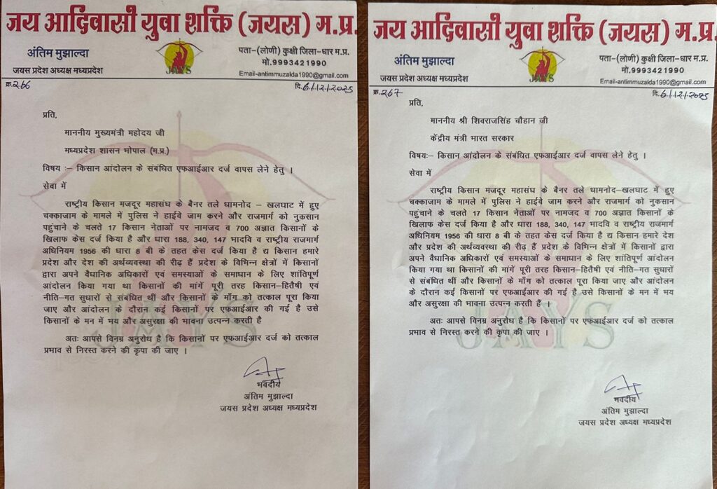 मध्यप्रदेश के माननीय मुख्यमंत्री मोहन यादव जी एवं कृषि मंत्री माननीय शिवराजसिंह चौहान जी को पत्र लिखकर अवगत करवाया पुलिस प्रशासन के द्वारा एफआईआर दर्ज की गई देश के अन्नदाता पर उसे प्रदेश सरकार तत्काल प्रभाव से निरस्त करवाए,,,